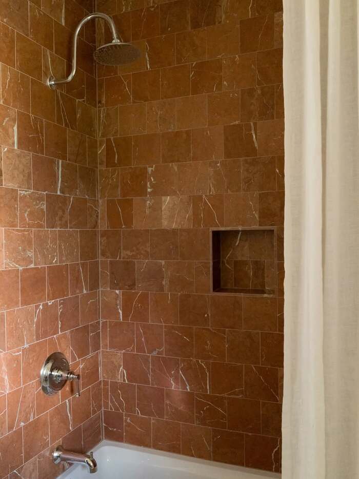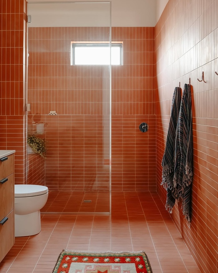 Okay confession. I thought orange in a shower would look like a 70s basement. Then this clay beauty changed my mind. The color is like warm bread. Pair it with vintage-style fixtures and creamy towels for balance. This belongs in any list of 10+ tile shower ideas because it brings heat without being shouty. It is also a smart tile shower design if you want to hide water spots.