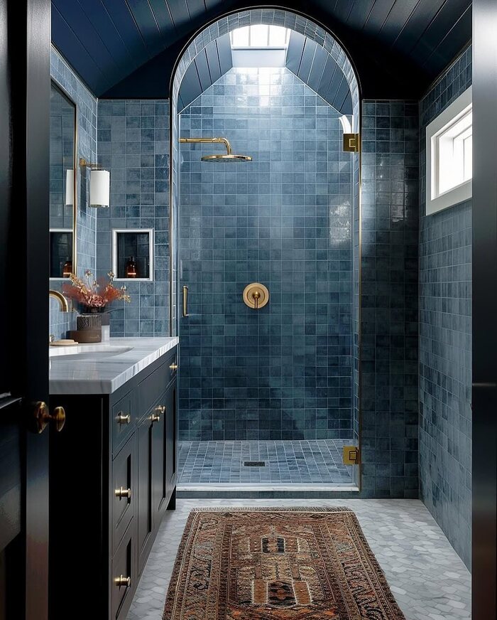 Moody blue zellige on every surface, even the arch, with brass hardware that glows. The waviness of these wall tiles gives life, no flat drywall vibe. I’d choose a grout one shade darker than the tile so lines blend. Add a skinny marble curb to break the field. This belongs at the very top of my 10+ wall tile list because it proves texture beats pattern when the color is deep.