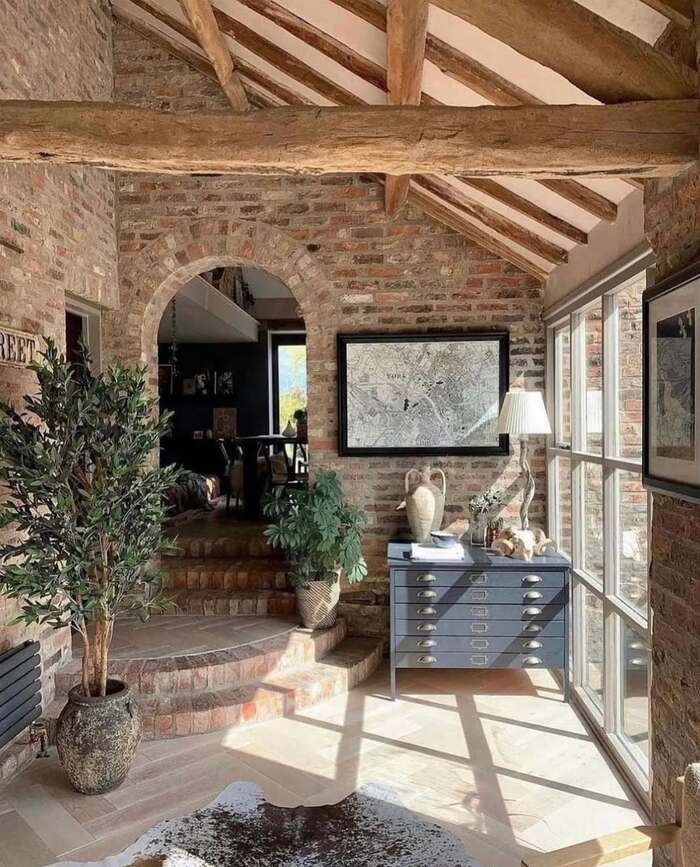 The rustic brick and arched step are dreamy. If you have a space like this that flows to a bath, carry the story with a neutral tile wall in the next room, something sandy and matte. It lets the brick be hero while the tiled wall handles steam and splashes. Small design truth, materials should feel like cousins, not strangers.