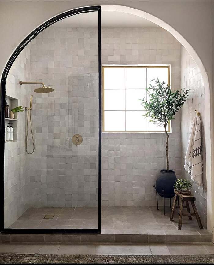This walk in shows creamy square wall tiles with gentle shade change, plus a black steel screen for edge. I recommend a warm white grout, not icy, to keep it cozy. Build a niche and line the back with the same tile, turned on the diagonal, tiny moment of joy. Another keeper in our 10+ wall tile roundup.