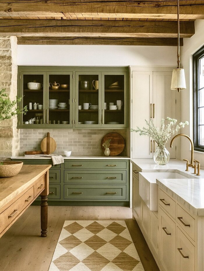 Muted green cabinets, oak beams, and a pale brick style backsplash, that is comfort. The tile backsplash has a little ripple, so it bounces light. For kitchens, I like satin glaze, wipes easy and still soft. End the tile wall at a clean vertical trim piece so it looks finished, not chopped.