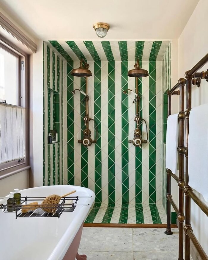 Vertical stripes of green and cream, cut on a diamond, wrap the shower head wall and ceiling. It makes the room feel taller and fun, but still grown. Tip from a job where I messed up once, align stripe edges to the niche so it feels planned. This bold move earns another spot in my 10+ wall tile notes.