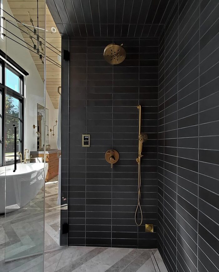 Long skinny rectangles stacked tight in charcoal, then brass fixtures pop. Use charcoal grout, not jet black, it hides lint and soap better. On ceilings, run the same shower wall tile to avoid that weird color line. This is a calm, hotel kind of luxury.