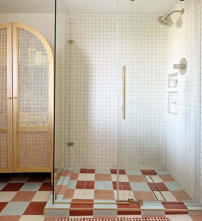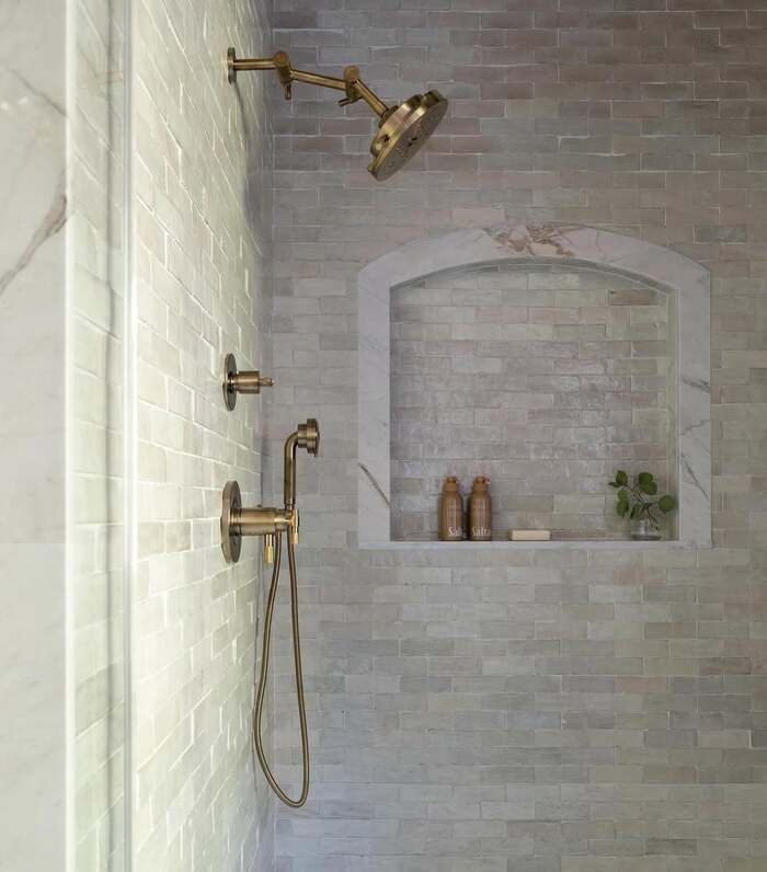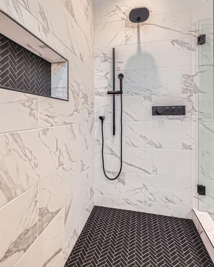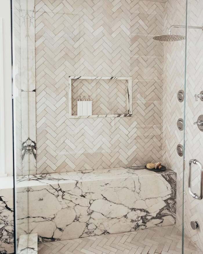 The room with large marble-look rectangles and a dark herringbone niche is chef’s kiss. A niche lined in contrast tile is a small cost for big design. It’s also practical because shampoo gunk is less visible. Do this in any white tiled bathroom if you crave a little mood.