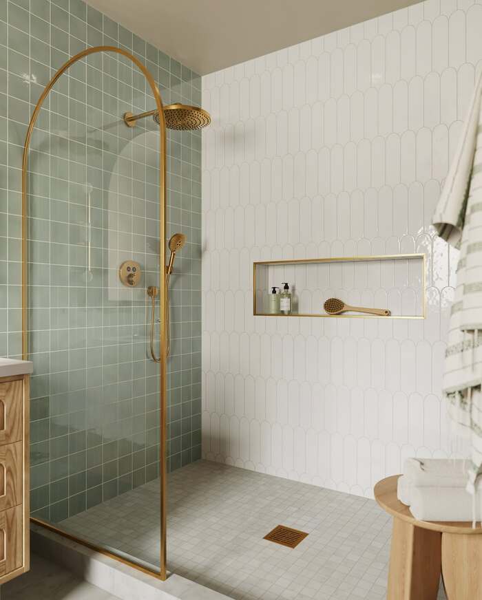 Skinny vertical rectangles, half-height, with plaster above, make a bright, quiet space. Great for a matte white tile bathroom where you want texture but not sparkle. Pro move: align the grout lines with the drain grate. When lines meet clean, the room looks more expensive than it was.