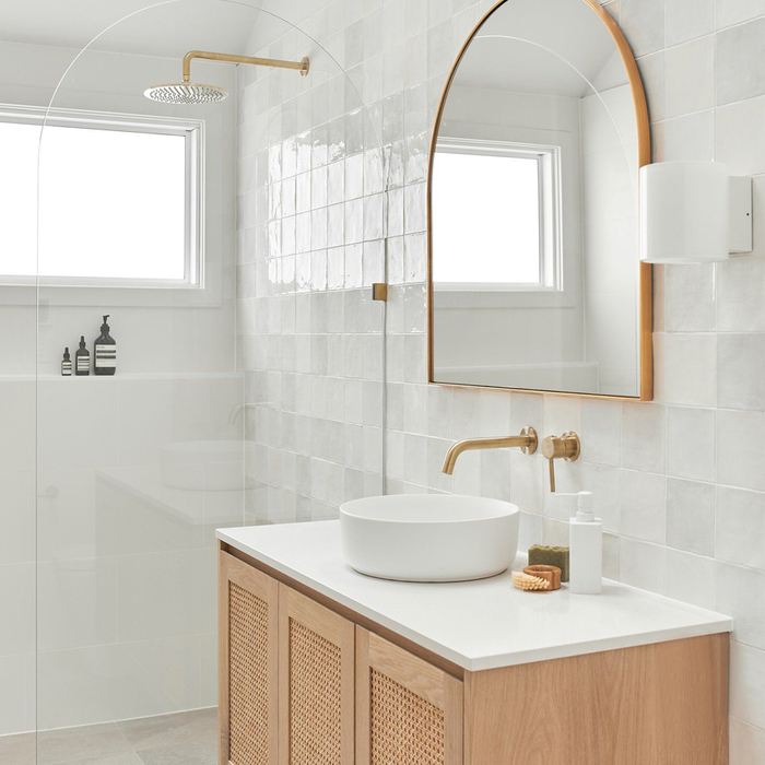 Brass, brushed nickel, or powder black all play nice with a 10+ white tile bathroom theme. Pick one tone and stick with it on every handle and hook. Then bring in a wood stool or a rattan-front vanity. A touch of oak turns an icy white tiled bathroom into a spa you actually want to linger in.