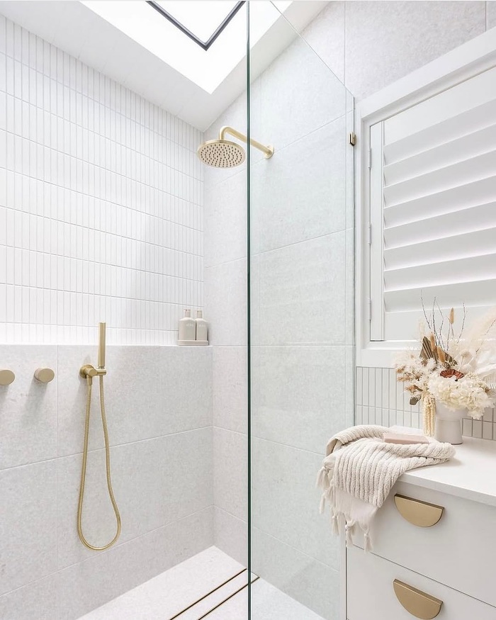 That first shower shows glossy, hand-pressed rectangles paired with warm brass. It’s a perfect modern white tiled bathroom move. My tip: use a warm white grout so the wall reads like a soft quilt, not graph paper. If you want a minimal white tile bathroom, skip busy accents and let the fixtures be the jewelry.